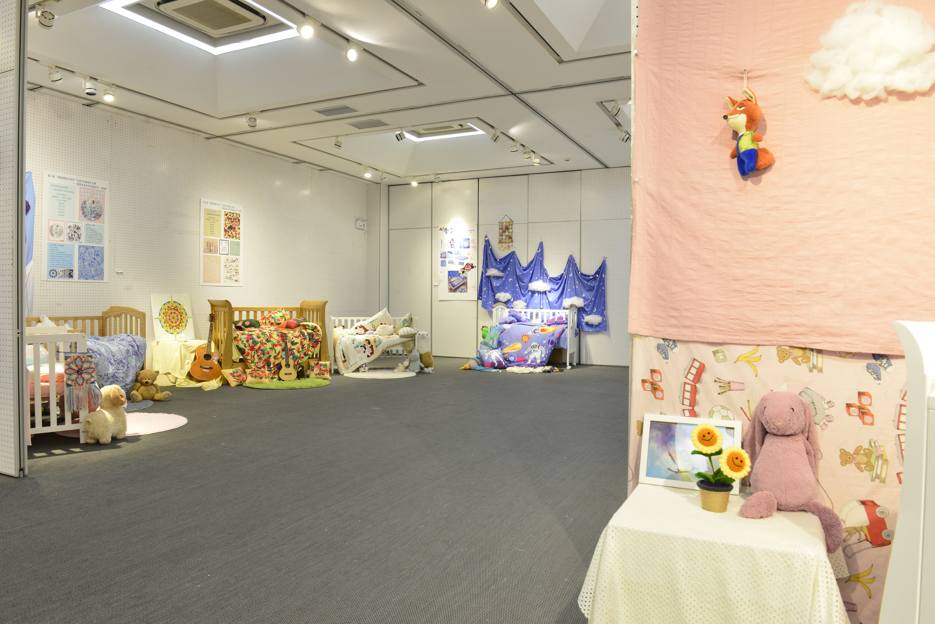 一楼婴童床品系列静态展,由参赛选手设计的30组作品一同展出。舒适的材料、童趣的布置,超萌且灵动,颜值满满,给宝贝贴心的呵护。经过严格筛选入围决赛的选手,针对0-3岁婴儿组和3-6岁儿童组,对婴童床品五件套(枕套、枕芯、被套、被芯、床笠),及婴儿床围、抱枕(靠枕)、睡袋、睡衣等关联产品,进行一系列的方案策划与产品创意设计。