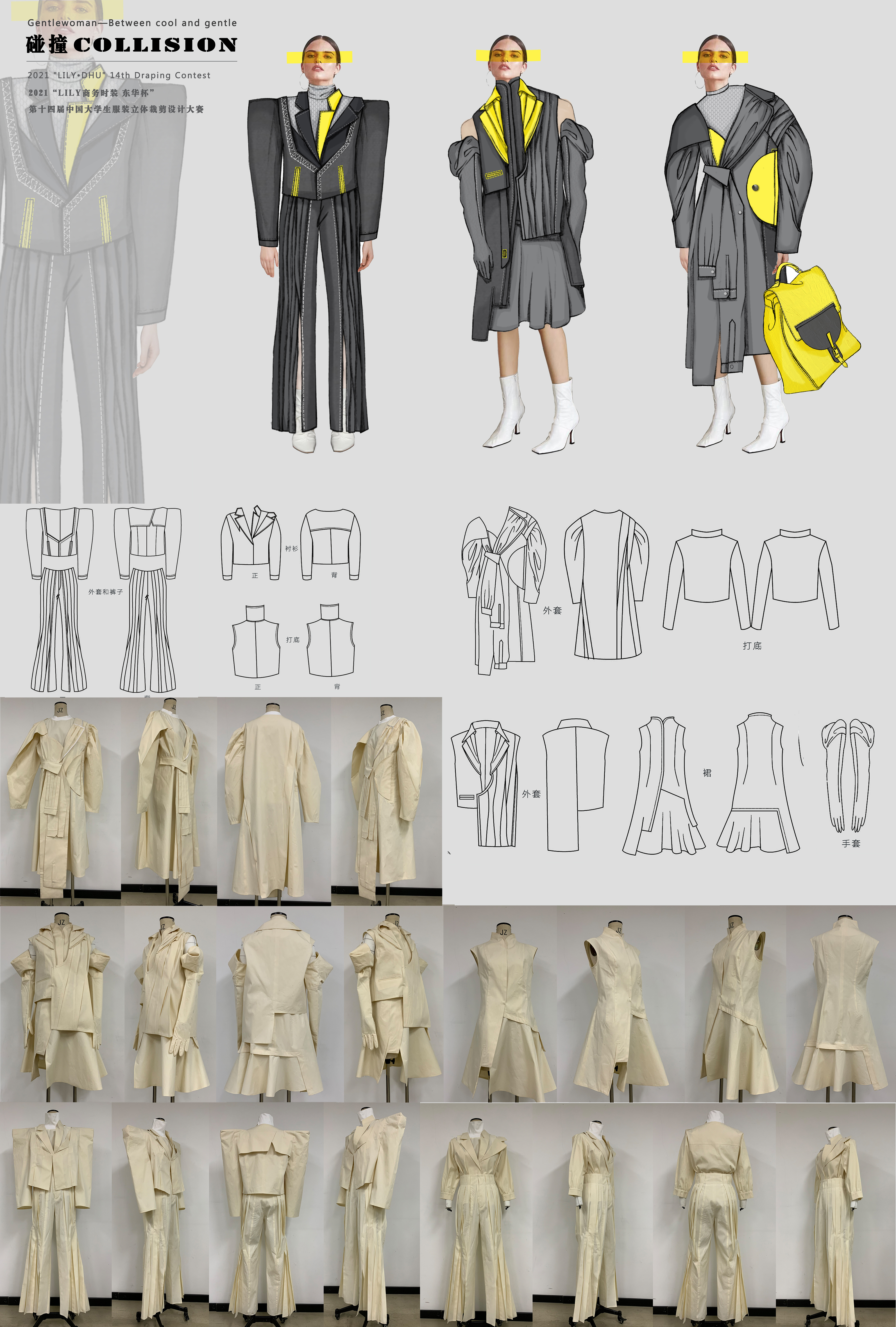 2022“LILY商务时装•东华杯”第十五届中国大学生服装立体裁剪设计大赛以团队赛的形式开展,以立体裁剪技术为依托,进行方案策划、服装设计和服装制作。方案内容包括:设计定位、灵感故事、款式设计(包括效果图、正背款式图、细节说明)、面辅料方案、立体裁剪坯样、工艺方案、成本计算等。