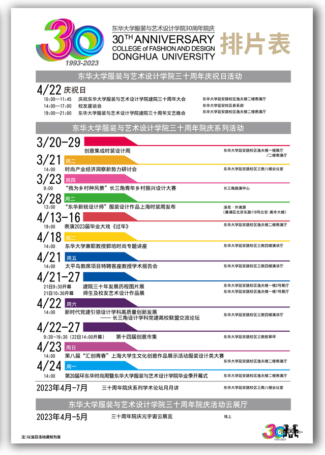 友里 30周年院庆是全体校友畅叙情谊、共谋发展的重要契机,也是学院赓续使命、展望未来的关键节点。学院将以“三十而立、三十而丽;美好学院、时尚大家”为主题,在4月22日举办庆祝大会、文艺晚会等,并在近期开展丰富多彩的系列庆祝活动。届时将根据活动场地等条件邀请安排部分校友参加现场活动,线上同步直播、云端展览等活动可供无法返校的学院校友广泛参与。