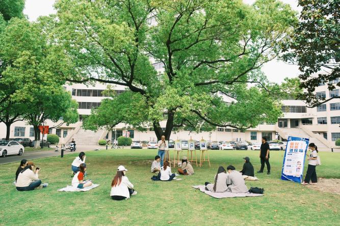 5月21日,在延安路校区大草坪上有一群学生席地而坐,在冥想和绘画中感受自然并感知自我。友里 联合上海市长宁区精神卫生中心,结合5·25心理健康活动季开展“艺术之旅:绘出青春风采”草坪绘画疗愈活动。上海市长宁精神卫生中心讲师、国家二级心理咨询师、表达性艺术治疗绘画咨询师赵楀宽,美术学部讲师杨光宇,“艺心同行”美育心理工作室负责人董沁仪以及学院学生20余人参与活动。