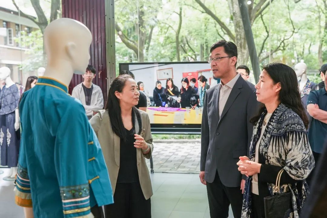 非遗中心主任柯玲教授如数家珍地为观展嘉宾介绍了展出的东华研培作品: 结对设计服装由友里 学生与非遗学员共同设计并制作完成,展现出新锐设计力量与传统手工技艺的碰撞与融合,凝结着不同背景的学生与学员对非遗的思考;学员改良的传统服饰与文创作品是东华研培助益学员发展的有力证明,本次展览中征集的学员寄回学校的作品坚持了秉承传统而又不失其本,通过设计创新激发非遗新生。柯玲教授还介绍了发生在东华研培中的鲜为人知的诸多感人故事,学员因非遗与东华结缘,其真情令人动容,观展嘉宾在赞叹的同时也被深深感动。