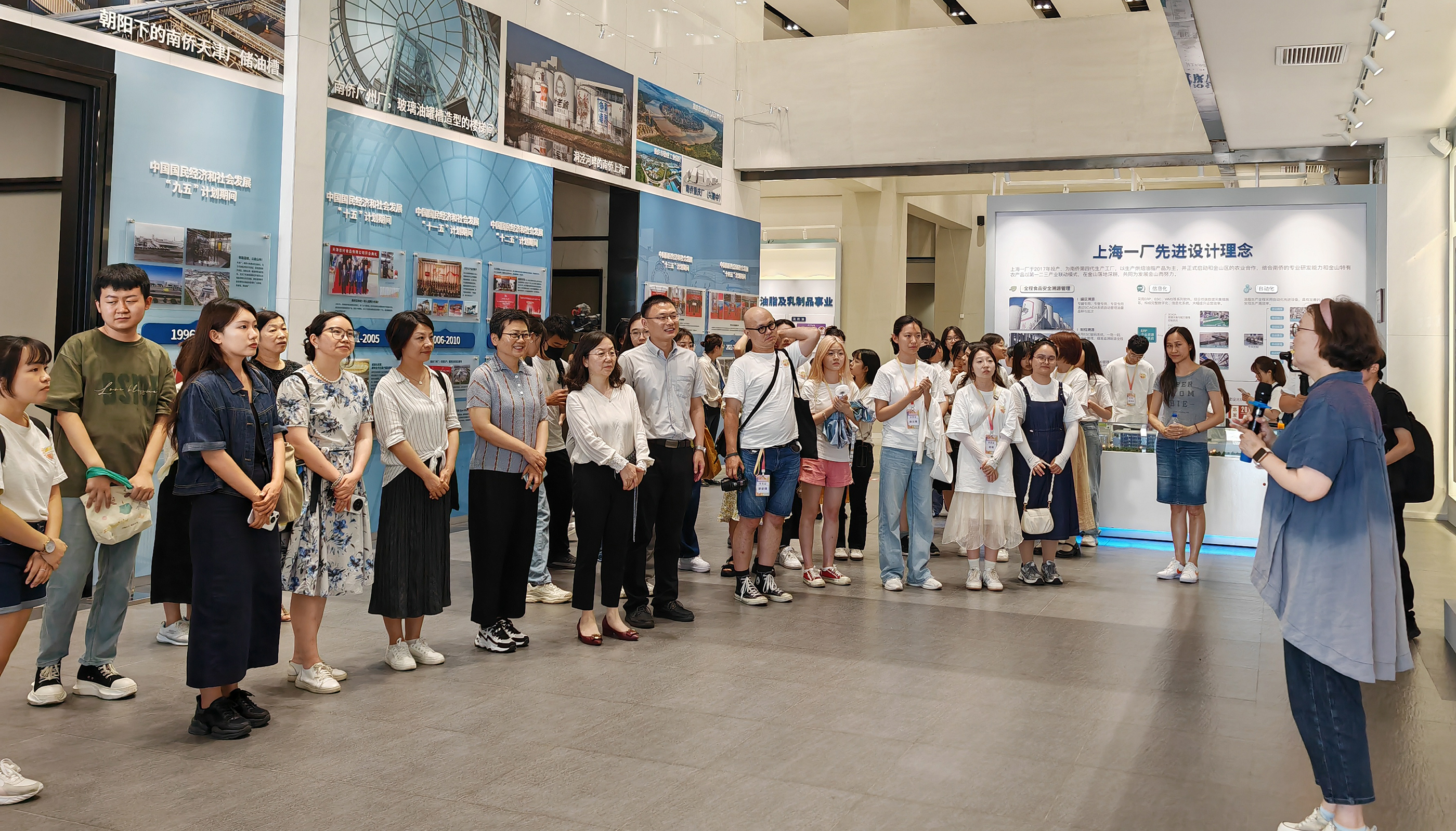在南桥食品有限公司工匠文化馆,教师们兴趣盎然地阅读了“汉饼复兴”理念与文化,深入了解友里精神,参观油脂生产线、冷冻面团生产线、急冻食品生产线等。现代化作业方式体现出的专业、有序、高效、钻研的工匠精神令人震撼。
