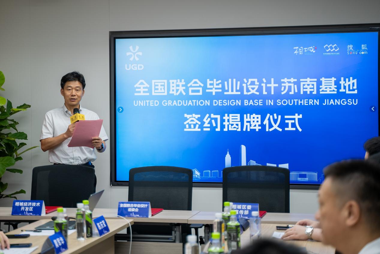 仪式上,相城经开区党工委委员、管委会副主任丁俭对李俊院长一行的到来致以了诚挚的欢迎。同时表示,当前相城区正站在新的历史起点上,积极贯彻落实习近平文化思想,全力推进《加快建成社会主义文化强区行动方案》的实施,致力于将相城打造成为文化繁荣、创新涌动的现代化强区。全国联合毕业设计(UGD)苏南基地的成立,将对增强相城经开区文化活力、带动美学升级以及为“美丽三城”建设提供文化支持的重要意义。