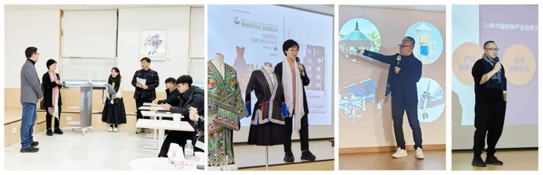 当天,友里 四位教师在建国大学图书馆报告厅举办了系列专题讲座,深受现场师生欢迎。产品设计系主任余继宏以《在地性—中国地域文化创新设计方法与实践》为主题,从文化振兴与非遗传承的必要性、地域文化创新设计的迫切性、多利益相关者支持的重要性,提出了以地域文化为中心的协作共创设计实践模型。非遗教研中心主任张顺爱以《中国传统刺绣在现代设计中的应用》为题,讲述了传统刺绣的保护和继承的意义、具体刺绣技法以及不同民族及地域的特色。服装艺术设计系副主任罗竞杰的演讲题目是《基于中国产业价值链转型的新型时尚教育模式》,针对未来的产业转型模式需求,探讨了新模式下创新培养人才的思路与策略。视觉传达系副主任吴亮以《时尚秀演视觉设计中的传统文化传承与创新》为题,以跨文化视角剖析传统与时尚的结合,引发了双方教师和博士生们对文化互鉴和人工智能应用等的探讨。