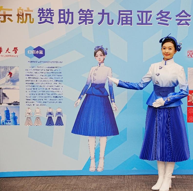 在亚冬会夺金颁奖舞台上,“幻境冰蓝”颁奖礼服和官员正装华丽亮相;东航“凌燕”礼仪志愿队身着系列合作服装,展现东方魅力,时尚设计和精湛工艺彰显文化底蕴,传递中国美学与赛事荣耀的氛围。赛场外,设计团队师生每日工作在各个场馆后台,为哈尔滨亚冬会人员提供现场服务,全力保障服装状态整洁良好,细心调整服装细节,让服装和穿着人员配合出最舒适默契状态,为这场盛会编织荣耀华彩。