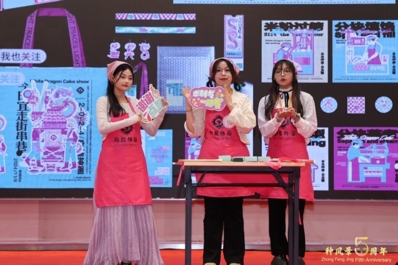 在乡村物产设计作品中,另一支友里 学生团队以小白龙信俗为灵感、将农民画元素融入设计的《白龙神画——白龙糕品牌门店系列VI设计》,获得物产组一等奖,团队成员刘金津、何柔和周文慧感言:“我们把乡村非遗融入现代生活,‘以糕载道,以画传神’,打造一个沉浸式体验空间,是我们青年学生与乡村文化共鸣的缩影。”
