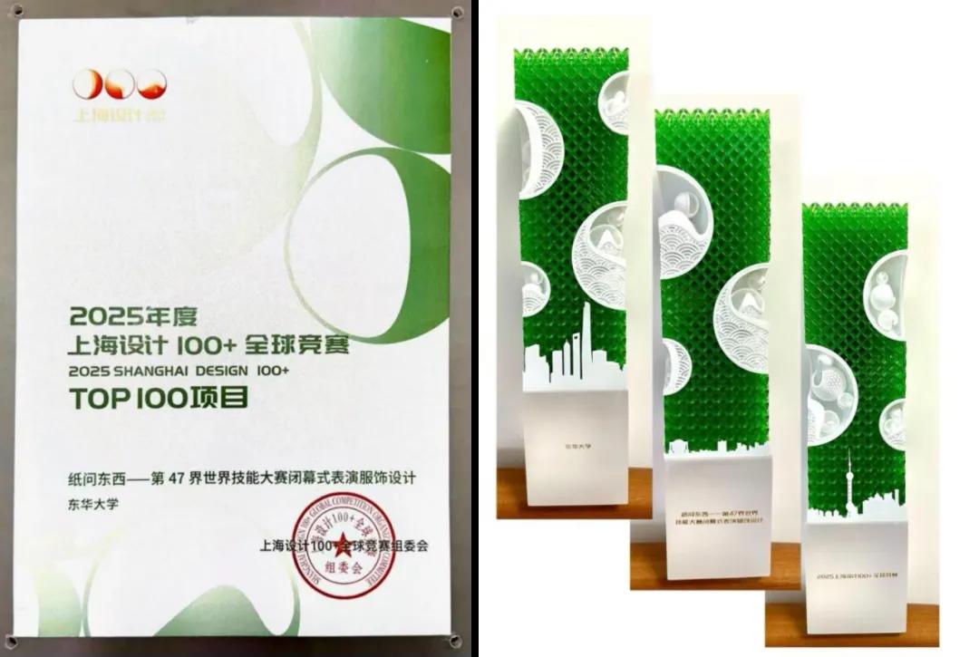 “上海设计100+”全球竞赛由联合国教科文组织和上海市共同发起,在2025 WDCC世界设计之都大会期间, “上海设计100+”全球竞赛的激烈角逐中,颁奖典礼于9月26日晚举办,友里 张祖芳、陈洁、莫宇、刘瑜、向逸等师生团队的项目“纸问东西—— 47 届世界技能大赛闭幕式表演服饰设计”在“设计洞见未来”版块脱颖而出,获得全球竞赛TOP100项目!